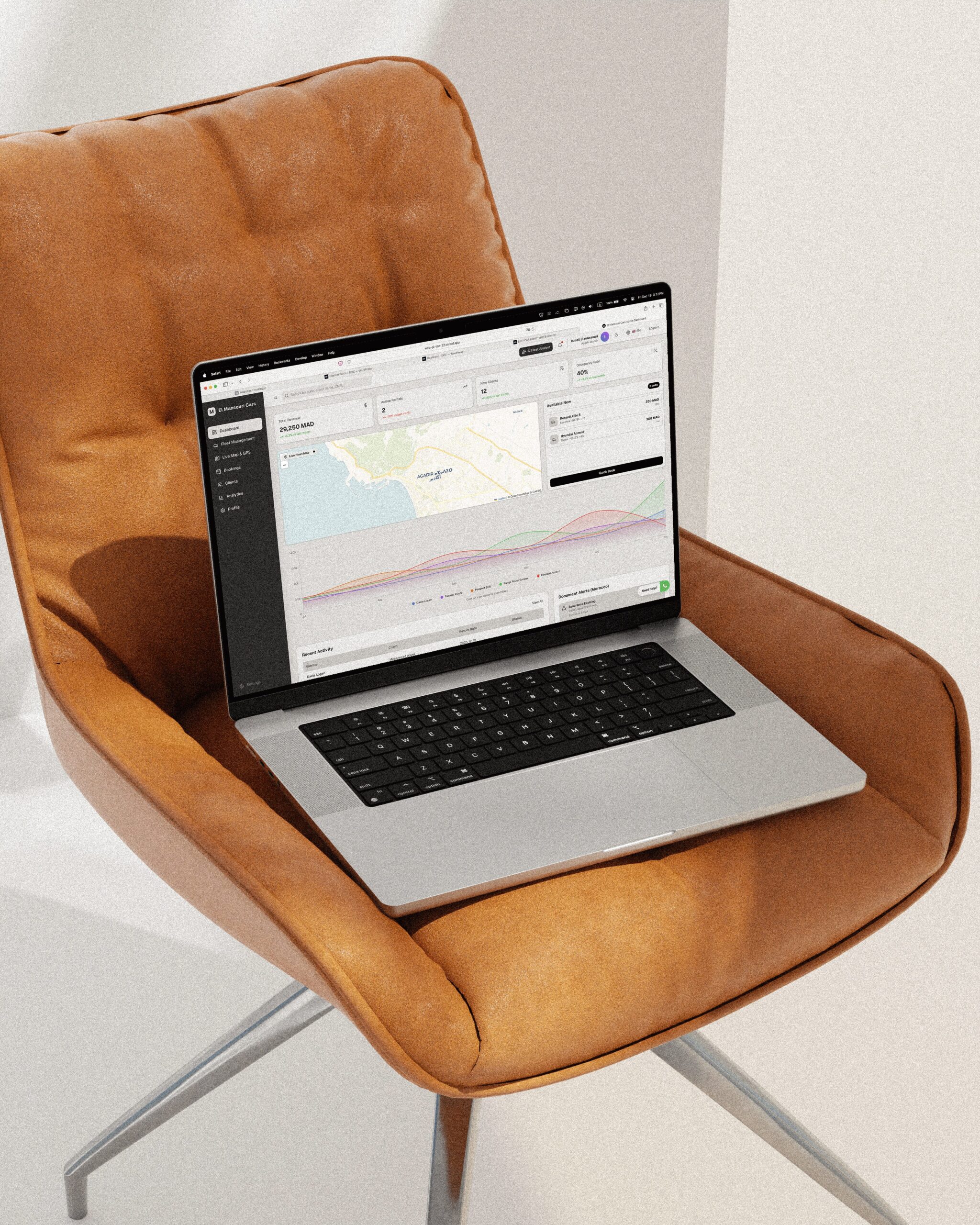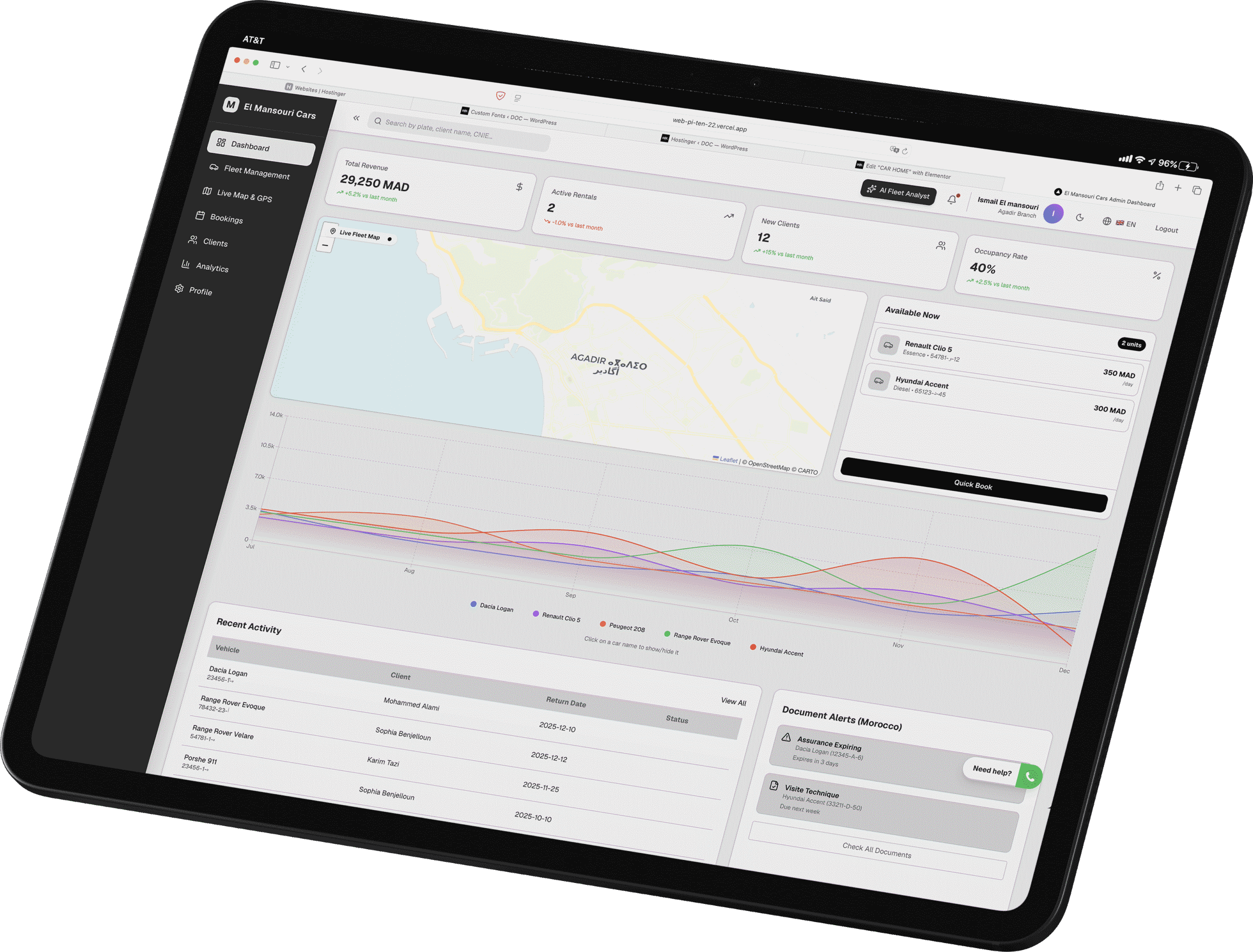 The Intelligent Dashboard is your command center. Track monthly revenue in MAD, monitor cars occupancy, and spot maintenance queues instantly. It’s not just data, it’s clarity.