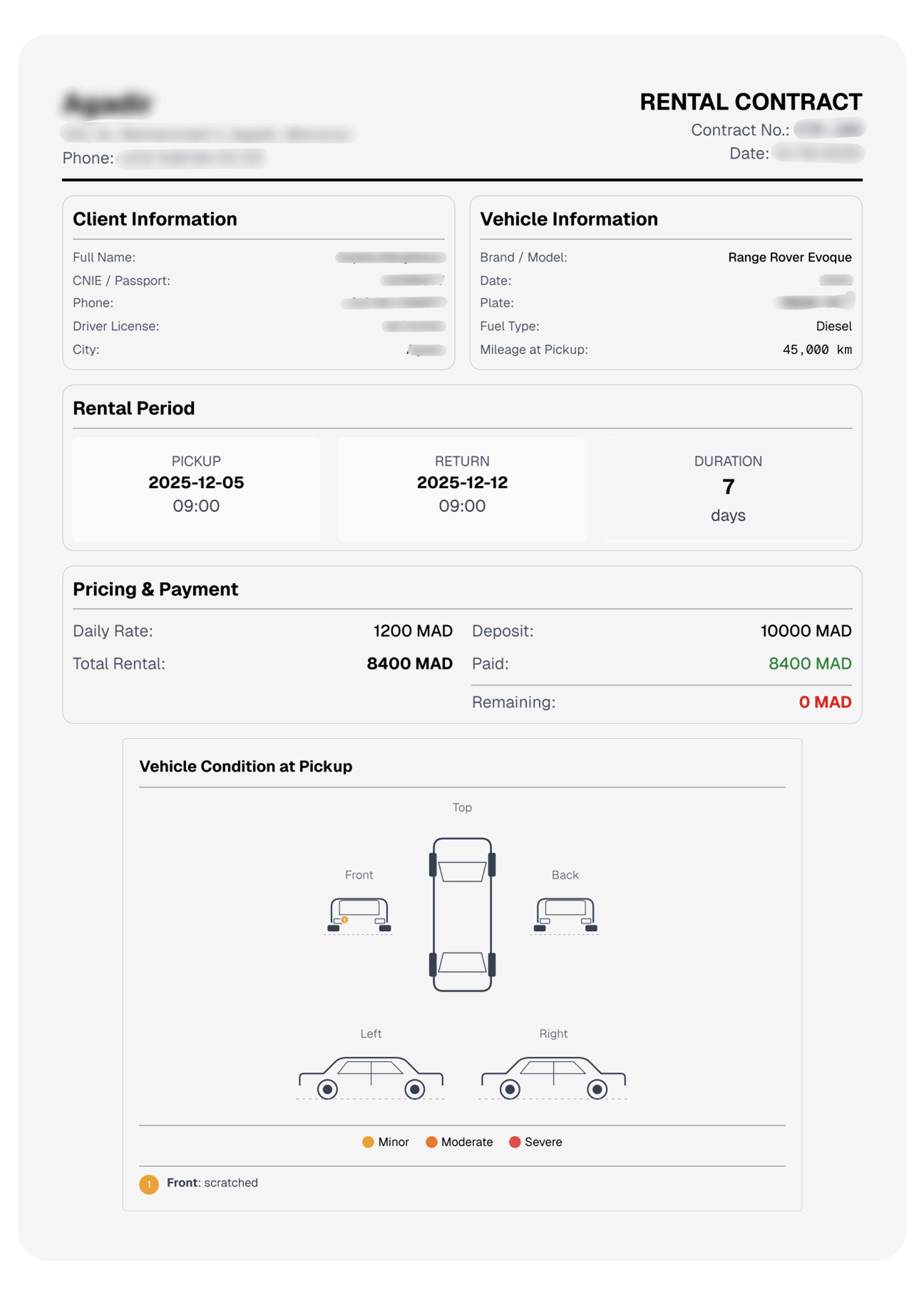 A professional-grade documentation system built right in. Use the interactive diagram to click and mark scratches and dents. Visual evidence is automatically embedded into every signed contract.