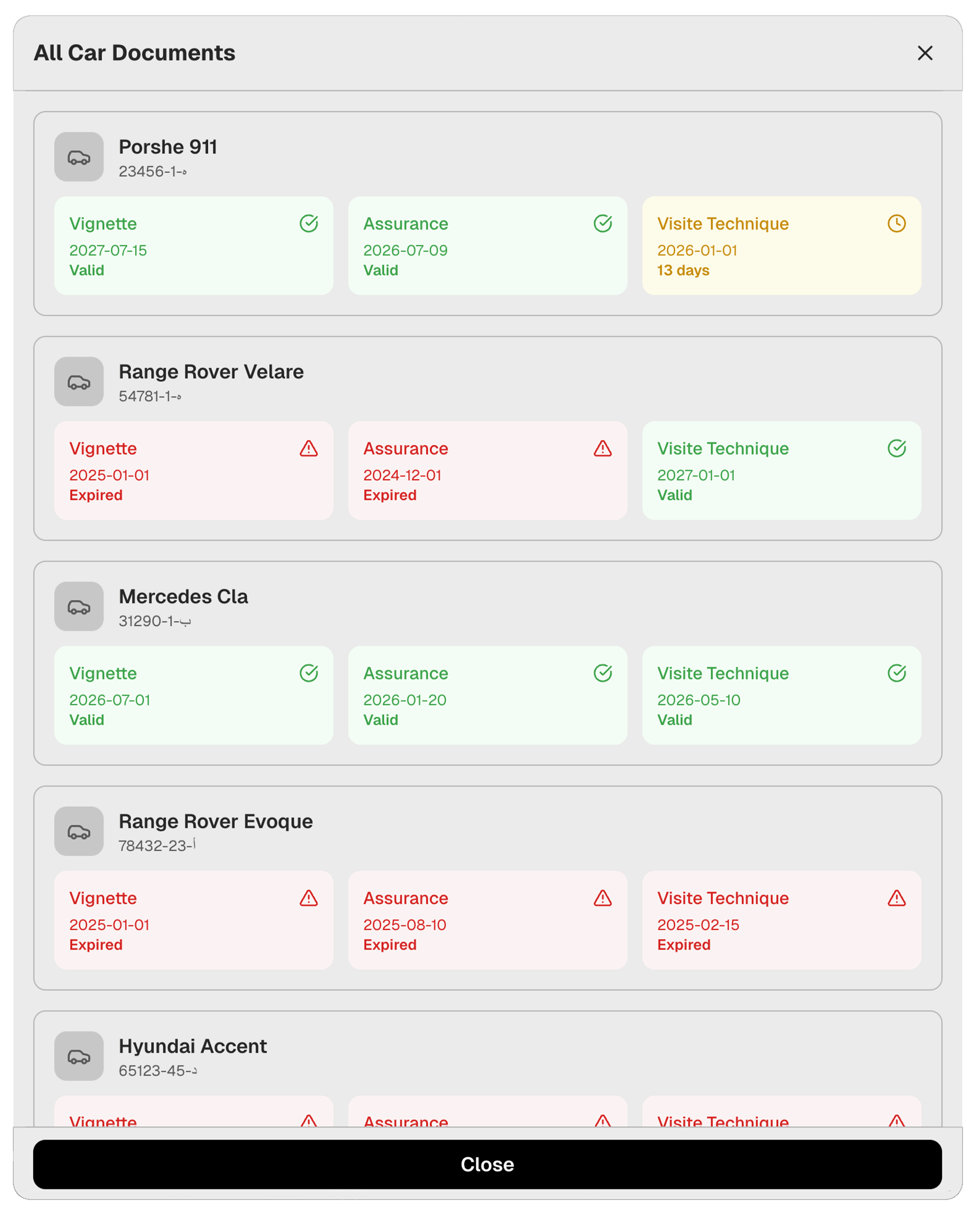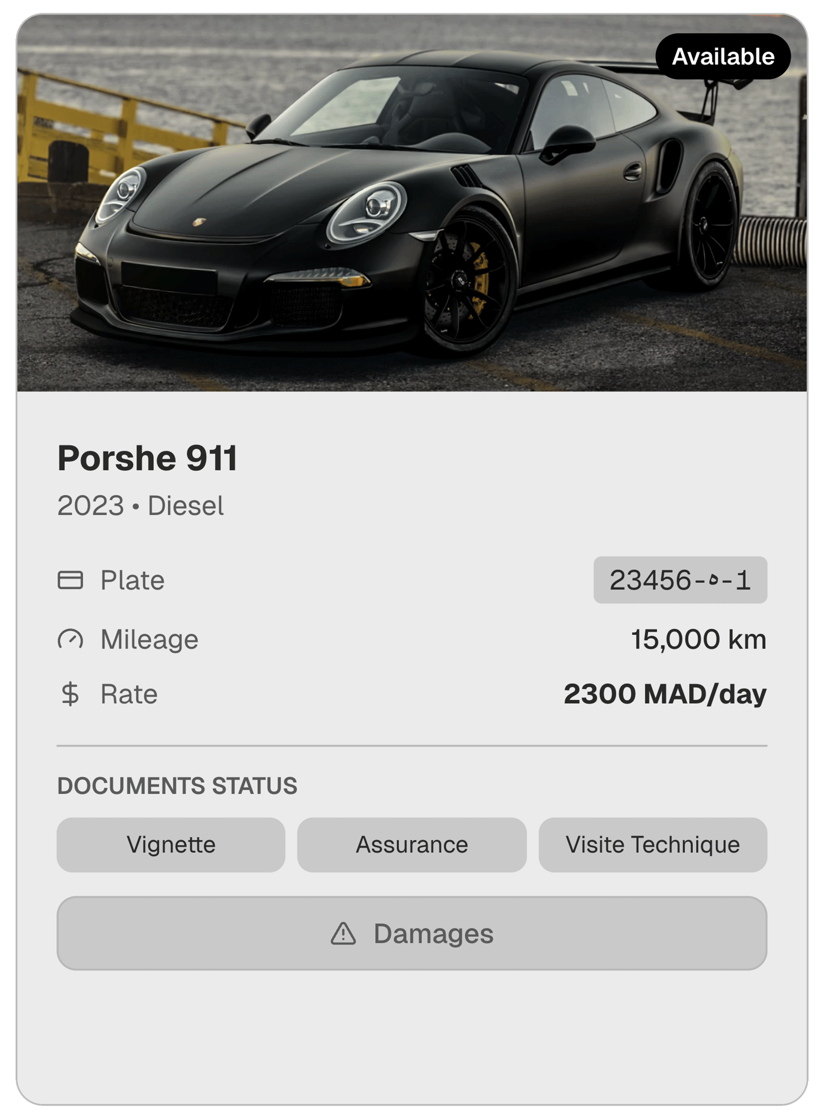 Complete vehicle context in one view. Monitor availability, mileage, and document expirations instantly. Spot damage alerts or book the car with a single click. Zero friction.